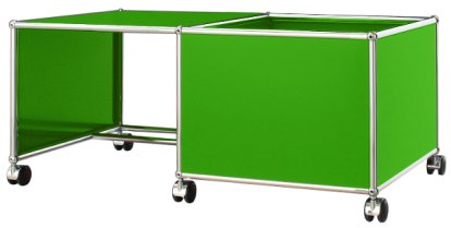 The USM Haller Mobile Table from Fritz Haller & Paul Schärer acts simultaneously as both desk and practical storage furniture. One half of the USM table provides space for painting and playing, while the other has a compartment into which toys and other objects can be securely stowed. Especially in the nursery, the colourful USM furniture for children proves itself as a practical and engaging aid to proper order; while on account of its six wheels, two of which are lockable, the table can be moved from location to location - even room to room. Available in the 15 standard USM colours the USM Haller Mobile Table is also available in two-tone colour combinations thus allowing it to provide a cheerful, individual, accent to any space. As with all items of USM furniture the USM Haller Kid's furniture is manufactured according to the characteristic USM modular concept: steel tubing forming a skeletal structure, filled with powder coated steel shelves, chrome plated brass balls acting as connectors and not only holding everything together but allowing for subsequent reconstruction. The USM Haller modular furniture system enjoys worldwide popularity and has become a genuine design classic. Through its modularity the USM system provides furnishing solutions which have the flexibility to grow with the child and thus serve not only as a childhood friend but a compagnon for life.