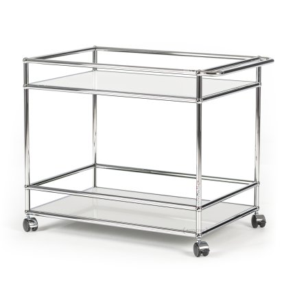 The USM Haller Bar Trolley by Fritz Haller & Paul Schärer is part of the very extensive product range of the Swiss manufacturer USM Haller and as with all USM furniture is constructed from three simple elements: metal tubing forms the structure, metal panels fill it out while chrome plated brass balls hold everything together. Two shelves of the USM trolley provide ample space for glasses and bottles, while the castors allow, and embody, flexibility and dynamism.