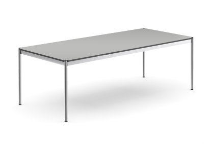 Although best known for the modular furniture system the USM Haller table is a central feature of the USM programme. The sleek chrome plated table frame beautifully reflecting the aesthetic elegance of the USM Haller units. Developed in 1963 by Swiss architect Fritz Haller, System USM Haller revolutionised office furniture of the period with its enviable ability to fit any situation and any given task: characteristics which can be be effortlessly carried over to the USM Haller table. Available in a range of lengths and depths and with a wide selection of surfaces there is a USM Haller for everyone and every occasion; and as befits a component of a modular system not only can every USM Haller table be complemented by a range of accessories but also used in varying functions, be it as dining table, conference table or desk.