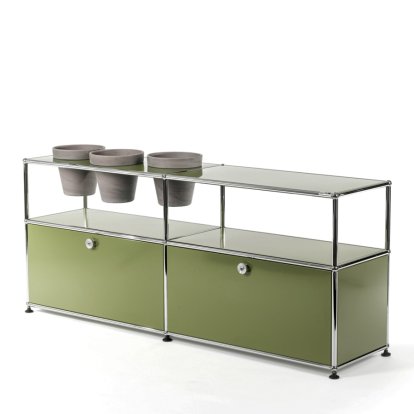 USM Haller Plant World Sideboard, Olive green RAL 6003, With 2 drop-down doors, With 3 pots on the left, Basalt
