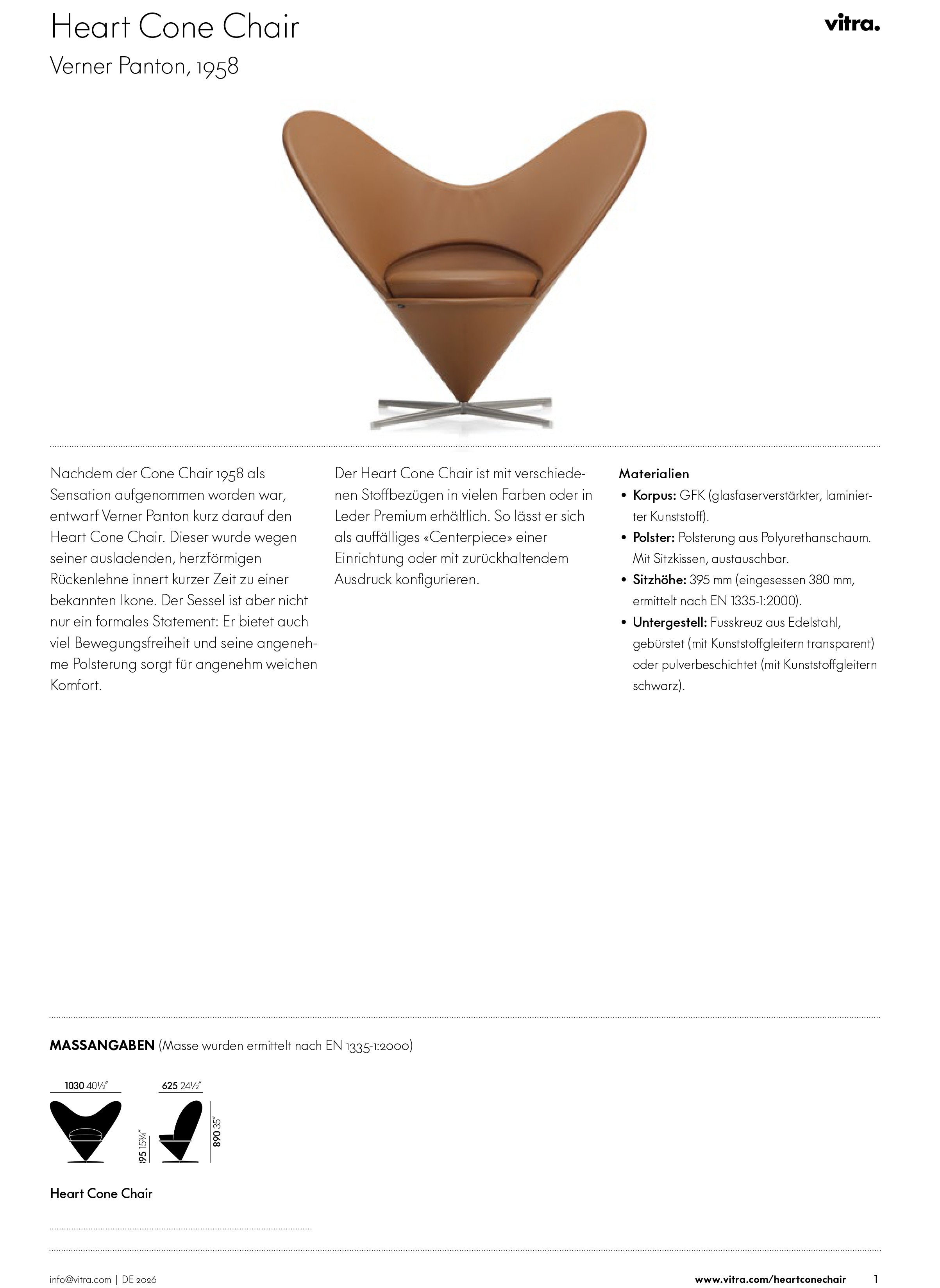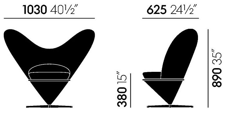 Verner Panton designed his Heart Cone Chair in 1959 and created with the extravagant chair a real furniture classic. Produced and distributed today by Vitra the Heart Cone Chair references the arrival of Pop Art, but appears as a new interpretation of the classic Chesterfield.