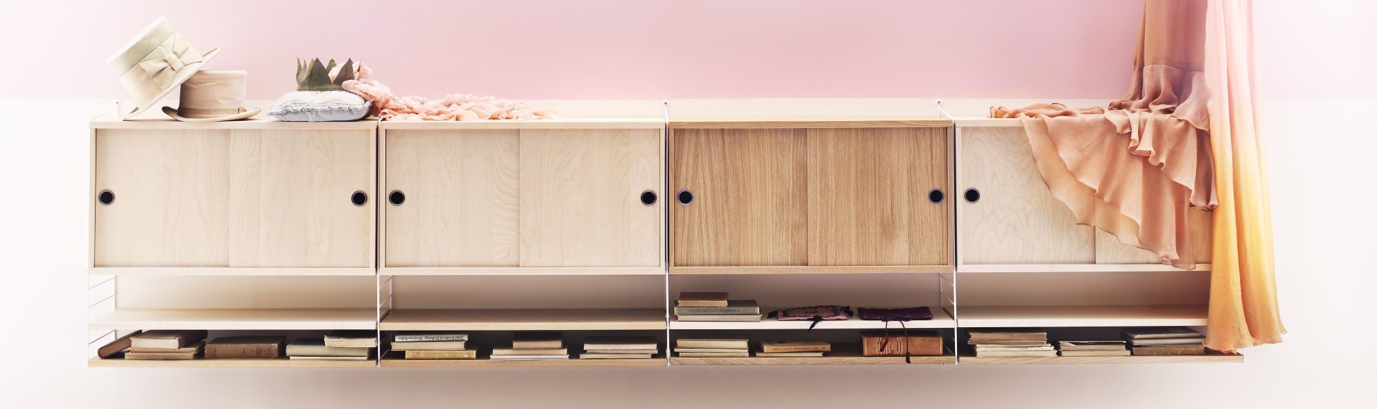 The basis of any String configuration is the side panels. Choose wall and/or floor ladders in your preferred sizes and colours and add shelves or other elements such as the cabinet with sliding doors, to create your own individual piece of furniture for the required space. As a universal shelving system string is suitable for walls large or small and for any given space, be that, living room, nursery or study.