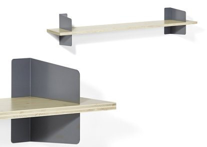 | Variants | Version 1: 2 small brackets and 1 shelf, available in 3 lengths Version 2: 2 large brackets and 2 shelves, available in 3 lengths Version 3: 1 small and 2 large brackets and 2 shelves, available in differing lengths (100 und 160 cm) Shelves available in various types of wood and brackets in a range of colours |