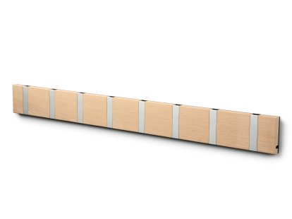 The Knax coat rack from the Danish manufacturer LoCa was designed by Harrit & Sørensen A/S and impresses with its simple yet elegant design. The aluminium hooks can be pulled out when needed and disappear in the wooden strip when not in use.